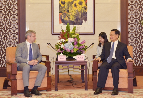 4月26日上午,省政府党组成员陈云贤在广州会见强生中国区主席、强生亚太区医疗器材集团主席孟启明一行。