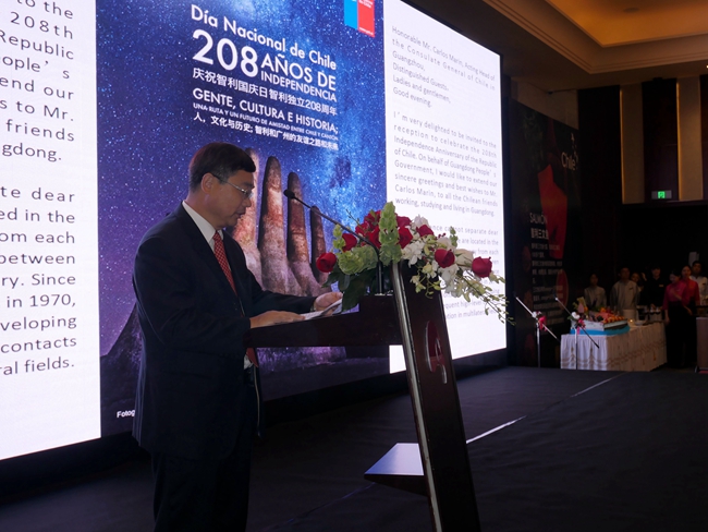 智利驻广州总领事馆代馆长龙啸天表示,在广东省政府的大力支持下,智利与广东的合作关系不断密切,领域不断拓展,今后希望与广东加强在经贸、农业等领域的合作,推动两地交流更上一个台阶。