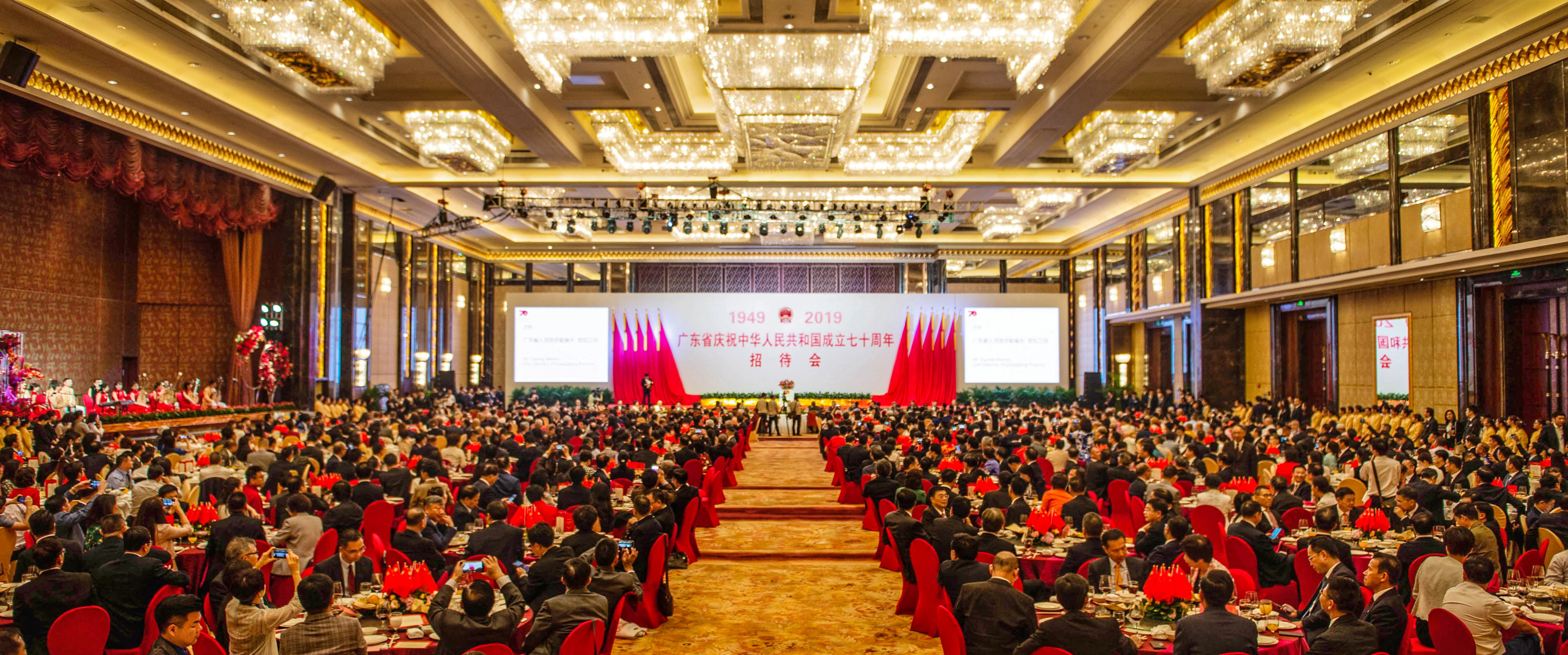 招待会会场正前方高悬庄严的国徽,“1949”“2019”两个重要年份在两侧红旗映衬下显得格外醒目,现场气氛喜庆热烈。